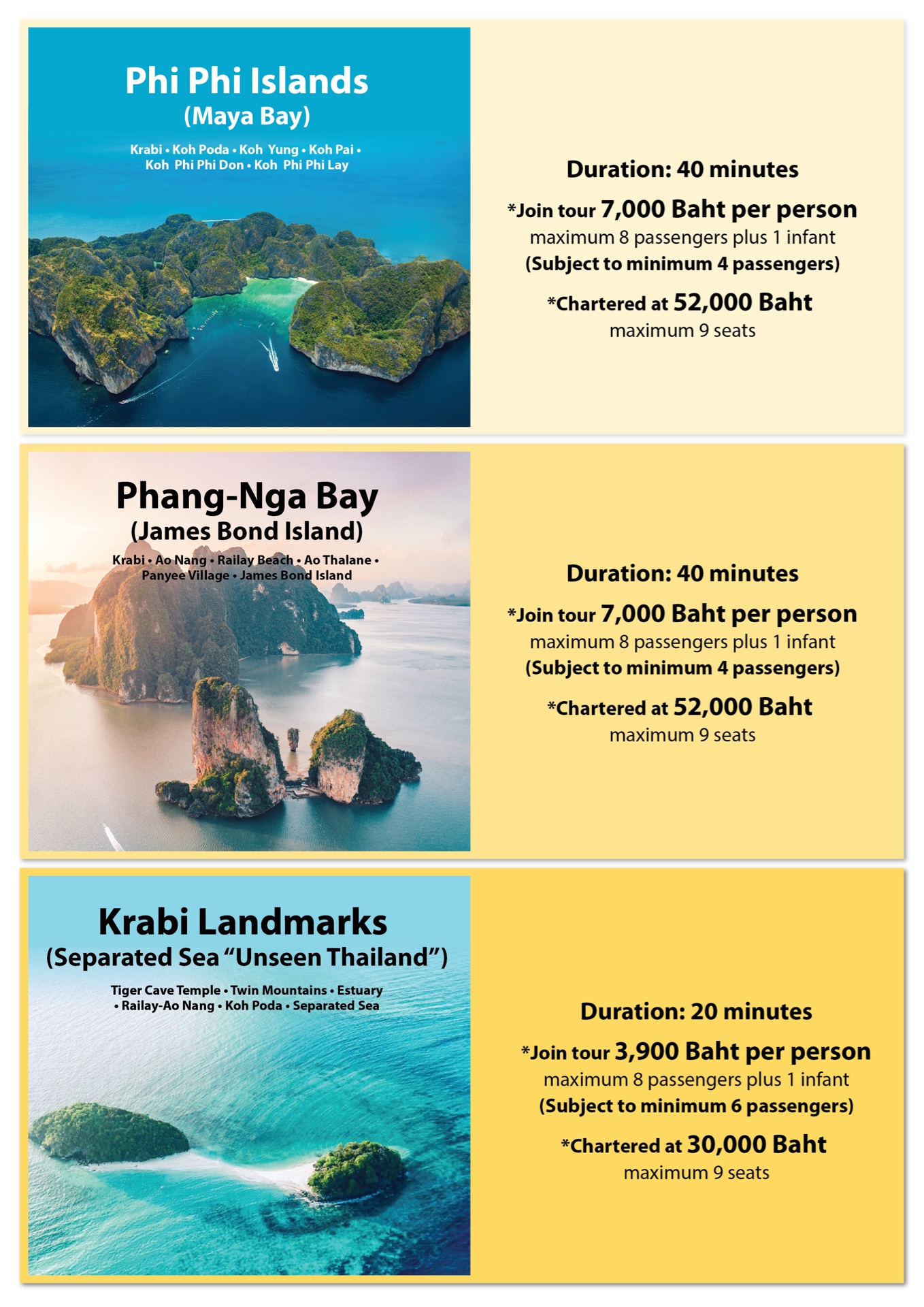 Take an exhilarating aerial tour in our in our Cessna Grand Caravan aircraft! Swoop low over Krabi’s iconic sights including Tiger Cave Temple, the Twin Mountains, Railay Beach-Ao Nang, Koh Poda and “Unseen Thailand” Separated Sea.